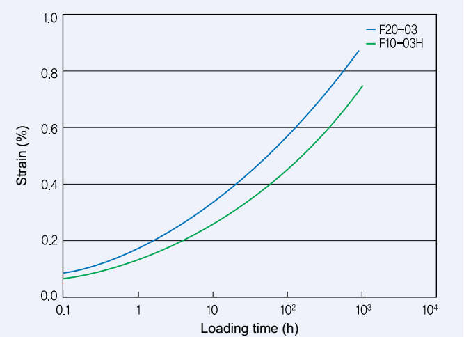 上图中可见,在恒定的拉力下,高粘聚甲醛F10-03H相对于中粘聚甲醛F20-03在相同的时间,具有更小的形变量,即高粘聚甲醛F10-03H具有更好的耐蠕变性。